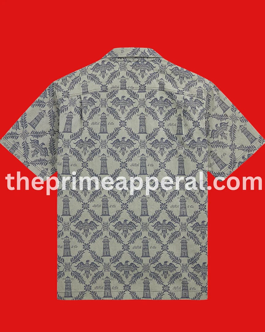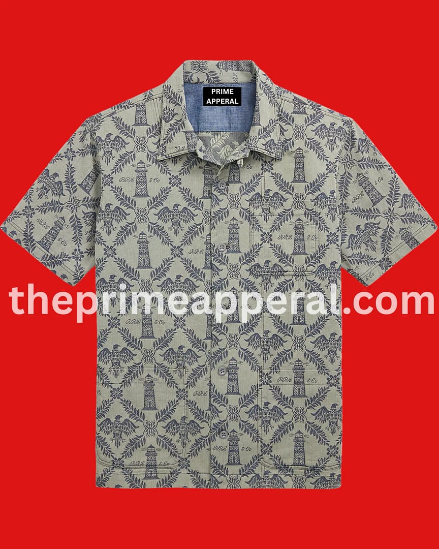 - Short-sleeve denim camp shirt with jacquard woven pattern